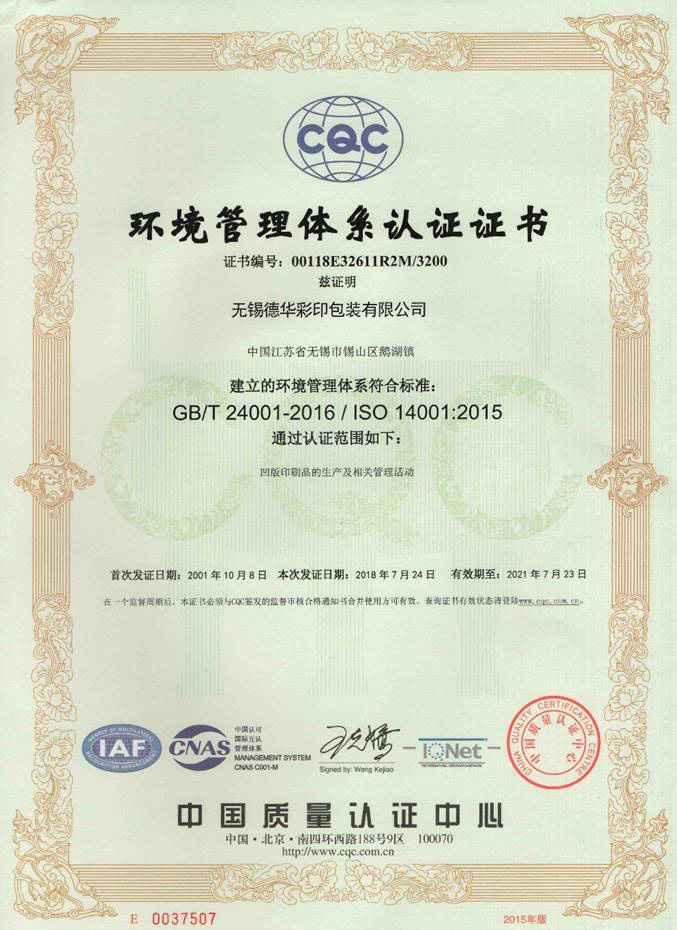 环境管理体系认证证书